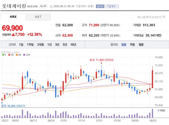 이미지 확대보기21일 한국거래소에 따르면 이날 오전 9시 39분 현재 롯데케미칼은 전 거래일 대비 12.29%, 대한유화 10.81%, LG화학 4.76%, 금호석유화학 4.42% 상승하고 있다.