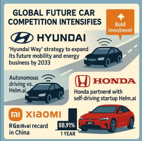 현대차는 2033년까지 1205000억 원을 투자하는 '현대웨이' 전략으로 전면 공세에 나선 반면, 혼다는 미국 실리콘밸리 스타트업과의 기술 제휴를 통해 2027년부터 자율주행 기술을 도입한다는 계획을 밝혔다. 중국의 샤오미는 전기차 진출 1년 만에 수익 달성을 눈앞에 두고 있으며, 최신 모델의 출고 대기시간이 최대 60주에 달할 정도로 폭발적 인기를 끌고 있다.