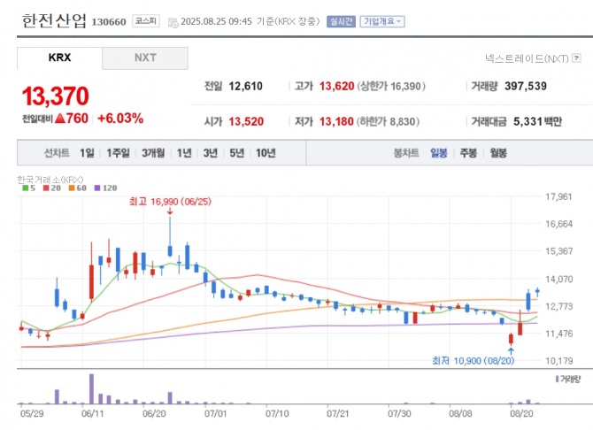 이미지 확대보기25일 한국거래소에 따르면 이날 오전 9시 45분 현재 한전산업은 전 거래일 대비 6.03% 오른 13만370원에 거래되고 있다. 이외에도 두산에너빌리티 2.09%, 한국전력 0.52%, 비에이치아이 1.35% 등도 상승세다.