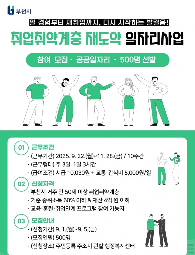 민삼숙 부천시 일자리정책과장은 “이번 사업이 중장년층에게 실질적인 일자리 기회를 제공하고, 재도약의 기반이 되길 바란다”며 “앞으로도 누구나 일할 수 있는 고용 환경 조성을 위해 지속적으로 정책을 추진하겠다”고 말했다.
