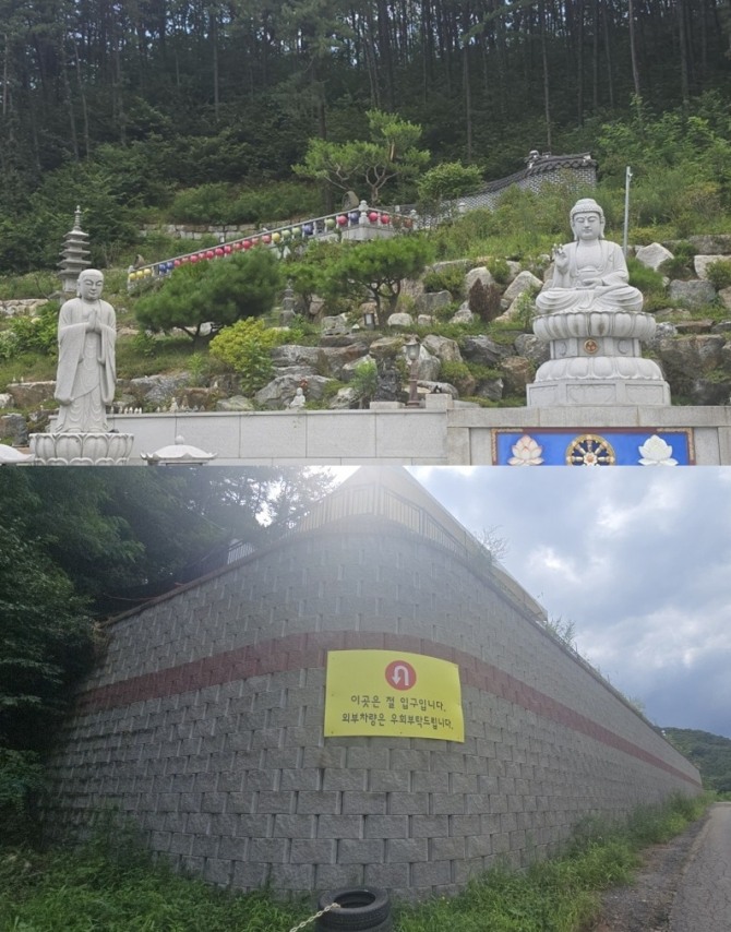 이미지 확대보기이 사찰은 시에 허가 없이 그린벨트 임야 등(약 2,565㎡)을 훼손해 석축을 쌓고 화장실·사무실 등을 무단 조성해 논란이 커지고 있다.