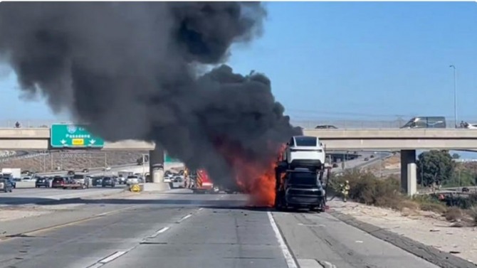 이미지 확대보기자동차 전문 매체 오토포스트에 따르면 30일 오후 5시 35분경(현지 시각) 캘리포니아 I-5 고속도로 남쪽 방면 실마 지역을 지나던 세미트레일러에서 불이 났다는 신고가 들어왔다. 목격자들이 촬영한 영상을 보면 불길은 트럭 운전석 부근에서 시작해 이내 트레일러 전체로 번졌다. 이 불로 트레일러에 실려 있던 테슬라 7대 중 최소 6대가 불탔다. 다행히 트럭 운전자는 화재 직후 신속히 대피해 인명 피해는 없었다.