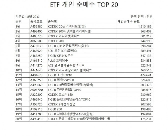 이미지 확대보기1일 한국거래소에 따르면, 지난달 29일 기준 개인 순매수 상위 20개 ETF 중 KODEX 브랜드는 8종목을 차지하며 시장 지배력을 다시 한번 증명했다.