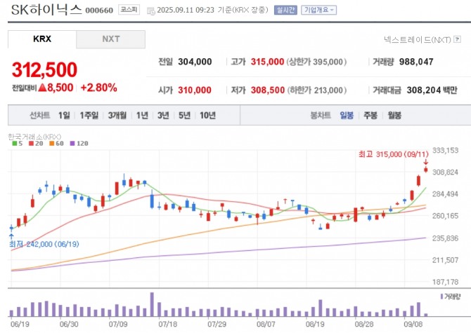 이미지 확대보기11일 한국거래소에 따르면 오전 9시 23분 현재 SK하이닉스는 전 거래일 대비 2.80% 오른 31만 2500원에 거래되고 있다. 31만 5000원을 찍으면서 신고가를 경신했다.