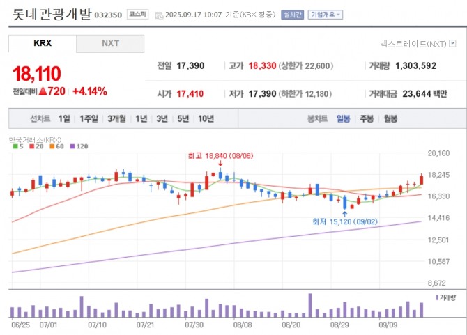 이미지 확대보기17일 한국거래소에 따르면 이날 오전 10시 7분 현재 롯데관광개발은 전 거래일 대비 4.14% 오른 1만8110원에 거래되고 있다. 파라다이스 3.29%, GS피앤엘 2.72%, 노랑풍선 2.22%, 모두투어1.99% 등이 오름세다.