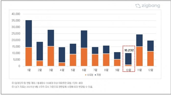22일 직방에 따르면 10월 전국 아파트 입주물량은 1만232세대다. 이는 이달(1만916세대)과 비슷한 수준이다. 2025년 월별·권역별 아파트 입주 물량 추이. 사진=직방이미지 확대보기