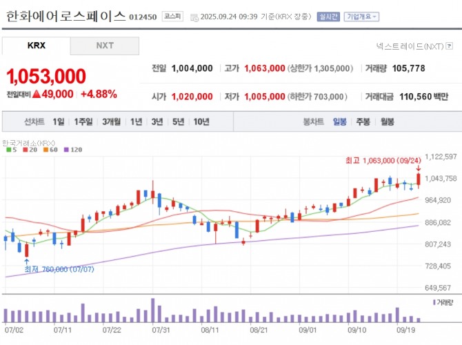 이미지 확대보기24일 한국거래소에 따르면 오전 9시 39분 현재 한화에어로스페이스는 전일대비 4.88% 오른 105만5300원에 거래되고 있다.