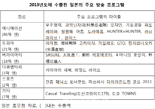일본 총무성에 따르면 텔레비전 프로그램의 방송권 등 방송 콘텐츠의 수출액이 2013회계연도(2013년 4월〜2014년 3월)에는 약 138억 엔(약 1284억원)으로, 전년도보다 30% 증가한 것으로 나타났다. 프로그램을 인터넷에 제공할 권리의 수출이 증가하고 엔화 약세도 수출액을 끌어올렸다.