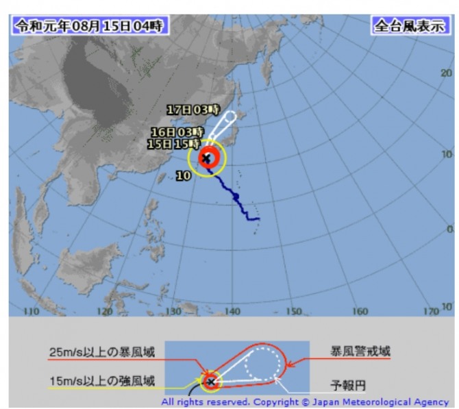 일본 기상청 태풍 제 10 호 (크로사) 令和원년 08 월 15 일 04시 50 분 발표