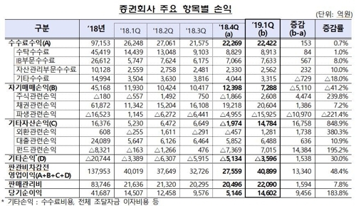 수수료 수익이 2조2422억 원으로 전 분기보다 0.7% 증가한 반면 자기매매이익은 7288억 원으로 41.2% 감소했다.
