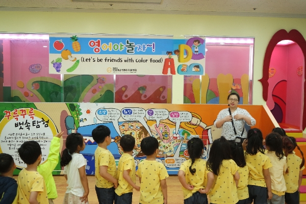 이번 캠프에는 ‘색깔 채소 많이 먹기’와 ‘식중독예방사업’의 일환으로 실시됐다. 3~5세 어린이들을 대상으로 오감 신체놀이 활동, 다양한 채소와 과일 종류의 몸에 좋은 역할 알기 등을 영어로 진행했다.