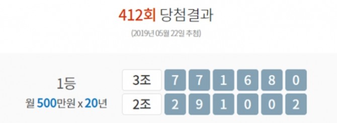 22일 수요일 오후 추첨한 제412회차 '연금복권520'의 2명의 1등 당첨번호는 '2조291002'·'3조771680'번이다.
