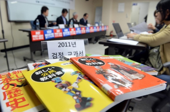 왜곡된 역사를 가르치는 2011년 일본의 검정교과서들이 책상에 놓여 있다. 사진=뉴시스