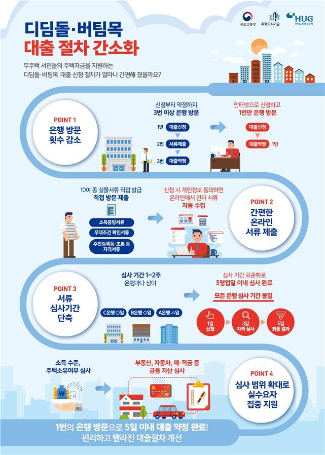 대출 처리 기간도 크게 단축된다. 그동안 은행 또는 담당자의 대출심사 여부에 따라 시간이 들쭉날쭉했지만 이젠 신청 뒤 3영업일 만에 대출자격 충족 여부를 알 수 있고, 담보물심사 등을 포함한 모든 대출심사도 5영업일만에 완료될 예정이다.