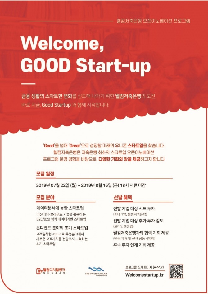 웰컴저축은행 관계자는 “이번 ‘웰컴, 굿! 스타트업’ 프로그램을 통해 웰컴디지털뱅크(웰뱅)에 적용할 수 있는 콘텐츠의 발굴과 함께 중장기적 협력 관계로 발전을 기대할 수 있는 스타트업에게 다양한 지원을 제공할 계획”이라며 “유망 스타트업을 포함해 혁신 기술과 아이디어를 가진 스타트업은 누구나 신청이 가능하니 많은 관심 가져달라”고 전했다.