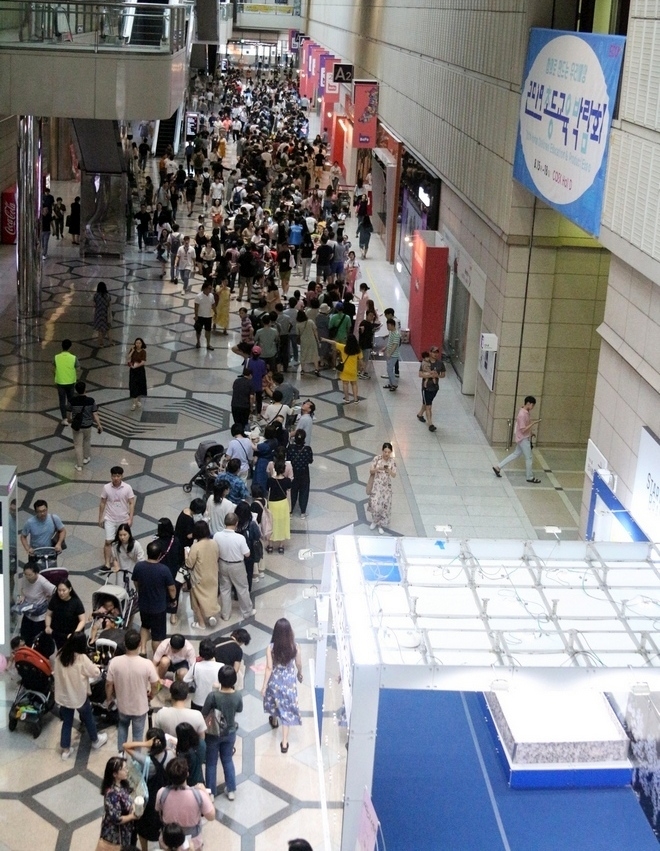 이미지 확대보기코엑스 A홀에 입장하기 위해 길게 줄을 서 있는 모습. 사진=정수남 기자 15일 74돌 광복절을 맞아 서울 삼성동 코엑스에 아기 울음 소리가 아침부터 우렁차다. 한편에는 칭얼대는 아이들도 많다.