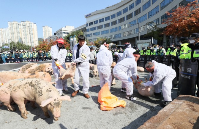 축산업계에 따르면 이날 '기습 시위'는 일부 양돈 농가가 최근 아프리카돼지열병(ASF) 사태에 따른 방역 당국의 '잔반 급여 금지' 조치에 반발하는 차원에서 이뤄졌다.