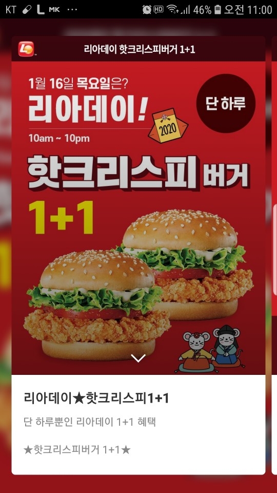 이와 별도로 이날 자정(24시)까지 롯데리아 앱에서도 핫크리스피버거 스마트 쿠폰을 1+1으로 판매하다. 해당 쿠폰은 1월 22일까지 사용할 수 있다.