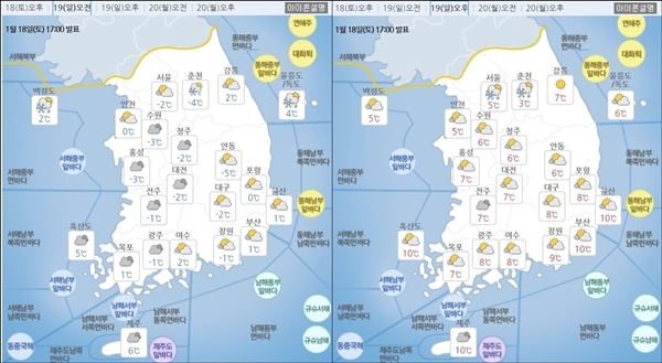 일요일인 19일은 북쪽을 지나는 기압골의 영향을 받아 전국이 흐리겠다. 특히 서울과 경기도, 강원 영서에서는 비나 눈이 오겠다. 충청도, 전라도, 경상도 내륙지방. 제주도에서는 산발적으로 빗방울이 떨어지거나 눈이 날리는 곳도 있겠다. 예상 적설량은 강원영서지방 1~5cm 정도다.