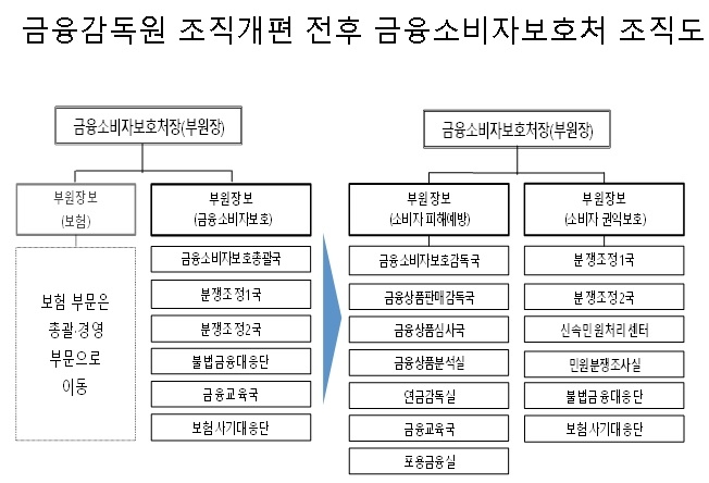 조직개편안에 따르면 금소처는 소비자 피해예방과 권익보호의 양대 부문으로 확대․재편하고 부문별 전담 부원장보를 운영한다. 금소처 조직은 現 6개 부서, 26개 팀(금융소비자보호 부문 기준)에서 13개 부서, 40개 팀으로 대폭 확충한다.
