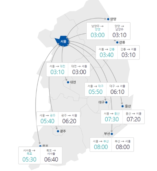 상행선은 ▲대전~서울 3시간 ▲강릉~서울 3시간10분 ▲대구~서울 6시간10분 ▲광주~서울 6시간20분 ▲울산~서울 7시간20분 ▲목포~서울 6시간40분 ▲서울~부산 8시간이 걸릴 것으로 관측된다.