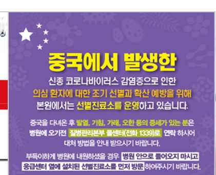 중국을 다녀온 후 발열, 기침, 가래, 오한 등의 증세가 있는 분은 병원에 오기전 질병관리본부 콜센터(전화 1339)로 연락 하시어 대처 방법을 안내 받으시기 바랍니다.
