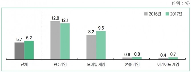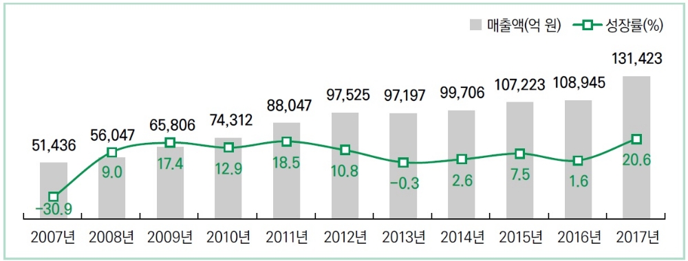 2017년에 이어 지난해와 올해도 국내 게임산업은 지속 성장을 이어갈 전망이다. 2018년 국내 게임 시장 규모는 2017년보다 6.5% 상승한 13조9904억원을 기록할 것으로 예상된다. 다만 올해와 내년의 국내 게임산업 매출 증가율은 각각 3.9%, 2.4%로 추정된다. 시장 규모 성장은 계속되지만 증가율이 감소하는 정체 국면으로 접어들고 있다는 평가다.