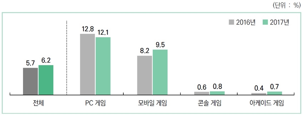 전 세계 게임 시장에서 한국의 위상을 살펴보면, 2017년 기준으로 한국은 전체 게임시장 매출의 6.2% 비중을 차지하고 있다. 미국과 중국, 일본에 이어 4위에 올라있다. 한국의 PC와 모바일 점유율은 각각 12.15%, 9.5%로 세계 3위, 4위를 차지했다. 한국은 최근 몇 년간 가장 높은 경쟁력을 보유하던 PC게임 시장에서 2위 자리를 유지했지만 미국의 추격으로 2017년부터 3위로 밀려났다. 모바일 게임 시장 역시 2015년 14.1%의 점유율로 2위를 차지했던 것에 비하면 규모가 점차 축소되고 있는 추세다.