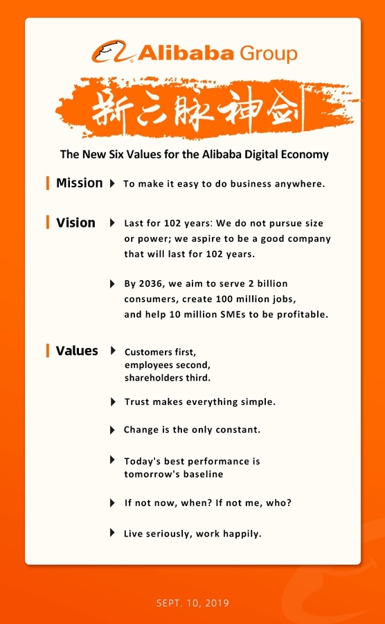 '어디서든 비즈니스를 하기 쉽게 만든다'는 사명과 '102년 이상 사업을 이어가는 기업으로 성장한다'는 알리바바의 비전을 기반으로, 디지털 시대에 걸맞은 비즈니스를 창출하기 위해 수립됐으며, 기업 문화의 근간으로 채용에서 보수, 승진에 이르기까지 전반적인 인력 관리 프로세스에 적용될 방침이다. 6가지 핵심가치는 다음과 같다.