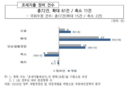 지난해 12월 국회를 통과한 개정 세법에서 조세지출(국세 감면) 항목이 모두 72건 정비된 가운데 이 중 61건이 국세 감면이 확대되는 방향으로 개정됐다.
