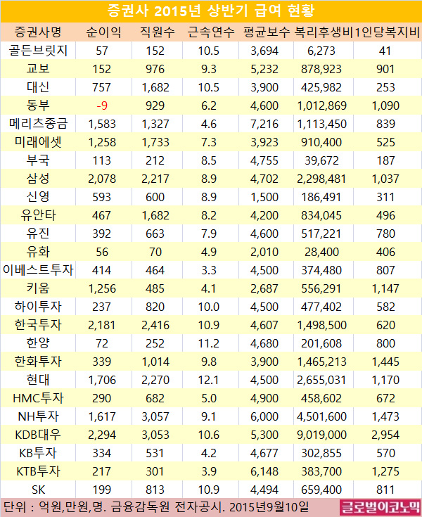 가장 급여를 낮게 지급한 회사는 유화증권이다. 유화증권은 올 상반기 2010만원을 지급해, 한달을 기준으로 하면 월 평균 335만원의 급여를 주는 것으로 나타났다.