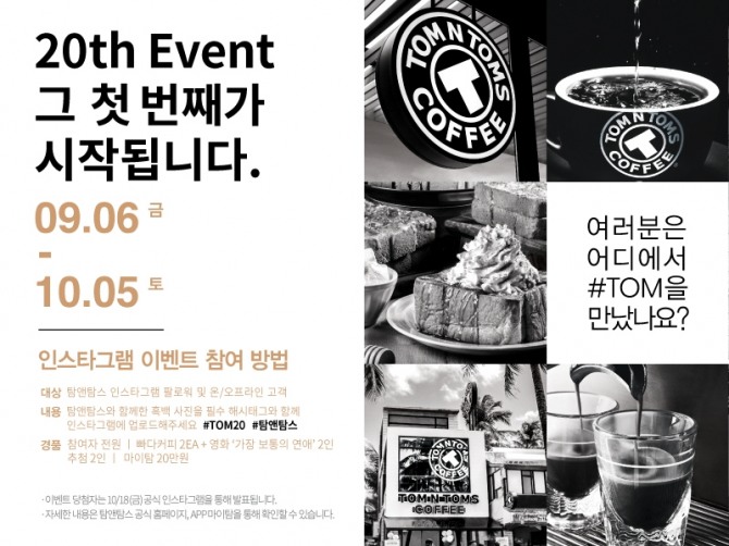 이미지 확대보기첫 번째 프로젝트는 6일부터 10월 5일까지 한 달 동안 ‘흑백 사진 공모전’을 실시한다. 인스타그램을 통해 진행되는 이번 공모전은 20년간 탐앤탐스와 추억이 깃든 사진을 필수 해시태그 #TOM20 #탐앤탐스와 함께 흑백으로 올리면 응모가 완료된다. 응모 때 사진 속 추억 이야기를 함께 남기면 당첨 확률이 높아진다. 이벤트 참여자 전원에게는 영화 ‘가장 보통의 연애’ 예매권 2매와 빠다커피 모바일 교환권 2매를 제공하며 1등 2명에게는 마이탐 카드 20만 원을 증정한다. 당첨자는 10월 18일 인스타그램을 통해 발표한다.