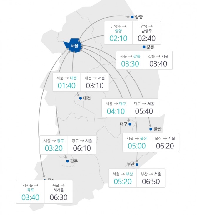 13시 현재 출발 기준 주요 도시 간 예상 소요시간(요금소 기준)은 △부산→서울 6시간 50분 △목포→서서울 6시간 30분 △광주→서울 6시간 10분 △대구→서울 5시간 40분 △대전→서울 3시간 10분 △강릉→서울 3시간 40분 등이다.