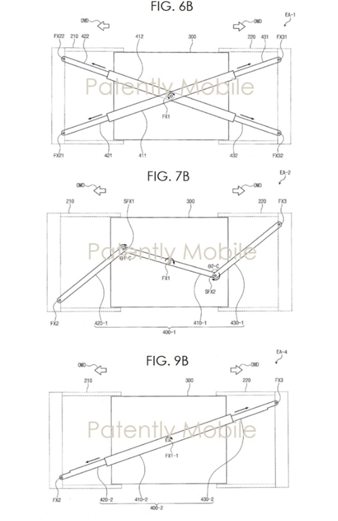 이미지 확대보기삼성전자의 특허도면 가운데 아래 6B, 7B, 9B의 특허도면은 삼성이 화면을 고정시키는 다양한 부분품과 힌지 구성을 보여준다. 이를 통해 삼성전자는 원래의 스마트폰 크기 단말기 좌우 측면을 잡아당겨 미니태블릿 크기의 단말기로 확장될 때 디스플레이 뒷면을 지탱하게 만든다.