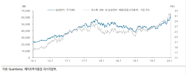 삼성전자의 독주가 이어지며 증시에 미치는 영향력도 세졌다. 삼성전자는 지난해 11월부터 코스피200 내 시총 비중이 30%를 돌파했다. 이달에 주가가 탄력을 받으며 시총비중은 확대되고 있다.