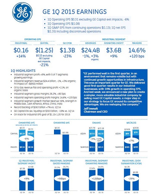 이미지 확대보기GE가 17일(현지시각) 발표한 1분기 실적에 따르면 매출은 244억 달러로 전년 동기대비 1% 감소했다.