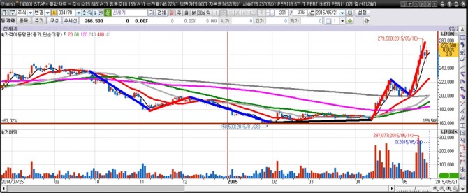 신세계 일간차트. 신세계는 최근 기관의 집중적인 매수세가 유입되며 강한 상승세를 보이고 있다.