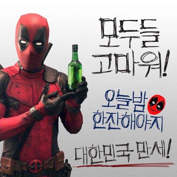 이미지 확대보기레이놀즈는 19일 0시 무렵 자신의 인스타그램에 "모두들 고마워! 오늘밤 한잔해야지. 대한민국만세!"라는 한글로 적힌 글과 함께 데드풀 복장을 하고 왼손에 소주병을 어깨 높이로 들고 오른쪽 손으로는 소주병을 가리키며 술을 권하는 제스쳐를 취한 사진을 올렸다. 레이놀즈는 사진 옆에 "건배! 데드풀대박♥ 한국만세'라는 글을 덧붙였다.