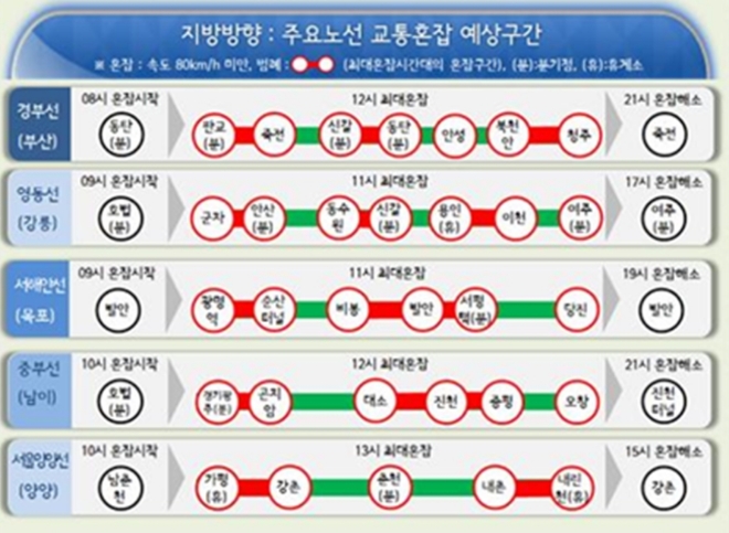 서울에서 대전까지는 2시간20분, 부산까지는 5시간20분, 목포까지는 4시간10분, 강릉까지는 3시간50분이 걸릴 것으로 예상된다. 지방 방향 정체는 오전 7시~8시에 시작돼 11시~12시 무렵 가장 막히겠다. 오후 8시~9시는 돼야 흐름이 원활해질 전망이다.