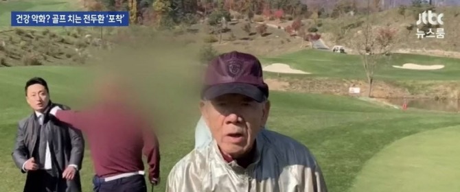 이미지 확대보기JTBC 7일 뉴스룸에는 전두환 전 대통령이 지인들과 함께 골프를 치는 모습이 나왔다.