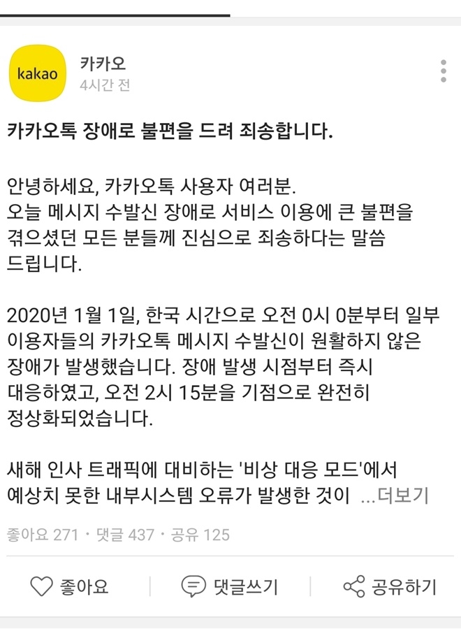카카오 측은 이날 오후 1시쯤 카톡 공식 계정을 통해 “2020년 1월 1일, 한국시간으로 오전 0시 0분부터 2시15분까지 카카오톡 메시지 수·발신이 일부 사용자에게 원활하지 않은 현상이 발생했습니다”라면서 “장애 감지 시점부터 즉시 긴급 점검을 시작하였고 오전 2시15분을 기점으로 완전히 정상화 되었습니다”라고 밝혔다.