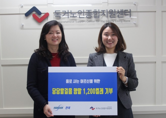 한독(대표이사 김영진·조정열)이 15일 독거노인종합지원센터에 '당당발걸음 양말' 1200켤레를 기부했다고 밝혔다.