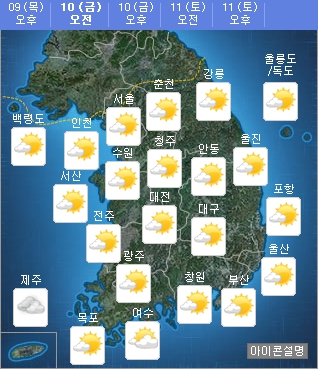 9일 기상청은 10일 내일 날씨를 서해상에 위치한 고기압의 영향을 받겠으나, 제주도는 제주도남쪽먼바다를 지나는 기압골의 영향을 받겠다고 전망했다.