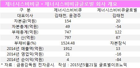 제너시스비비큐는 지난해 5월 31일을 분할기일로 해외사업부문을 인적분할해 (주)제너시스비비큐글로벌을 설립하면서 자본금 154억원을 갖춘 법인이 됐다. 제너시스비비큐글로벌은 자본금 20억원 규모다.