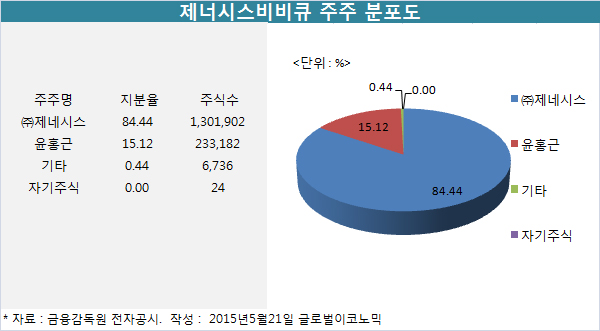 제너시스비비큐의 주주 분포는 (주)제너시스가 지분 84.44%인 130만1902주로 최대주주로 되어 있고, 윤홍근 회장이 15.12%인 23만3182주를 갖고 있다.