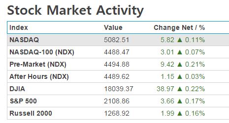 또 나스닥거래소에서 나스닥은 5.82포인트, 0.11% 오른 5082.51에 폐장했다.