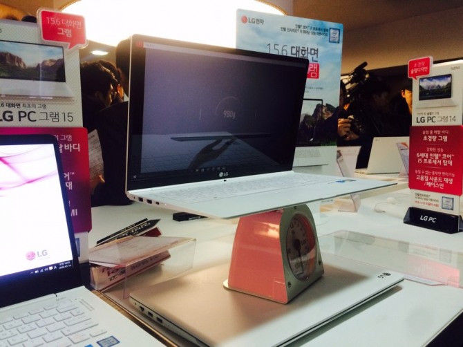 그램15는 15.6인치(39.6cm)의 대화면이지만 무게가 980g에 불과하다. 그란데 사이즈 커피 두 잔 무게에 불과한 것.