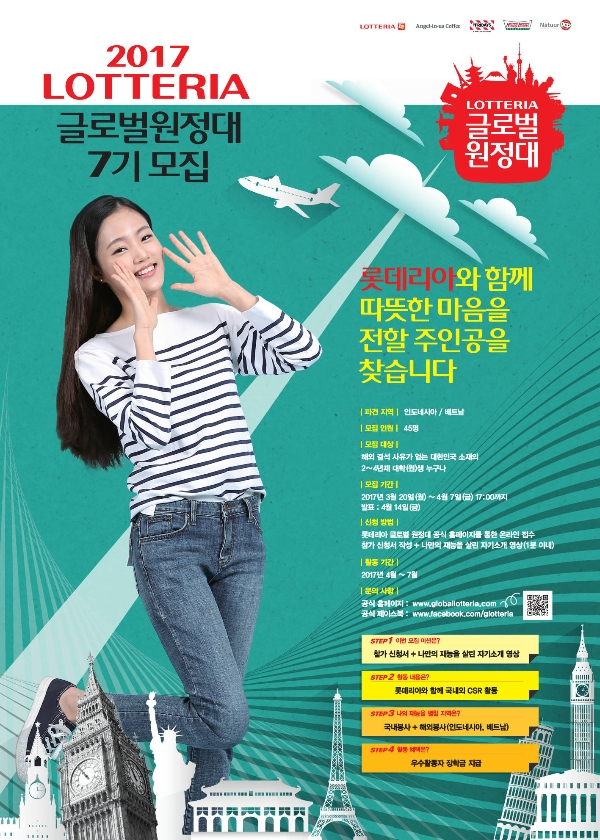 롯데리아가 대표 대학생 프로그램인 ‘글로벌원정대 7기’를 모집한다. 글로벌원정대 7기는 4월 7일 오후 5시까지 공식 홈페이지를 통해 지원 가능하며 4월 14일에 최종 선발 대원 45명을 발표한다. 선발된 글로벌원정대 7기는 오리엔테이션을 통해 미션을 안내 받고 롯데리아 해외 진출국인 베트남과 인도네시아를 방문, 현지 봉사 활동을 직접 기획하고 실행하게 된다.