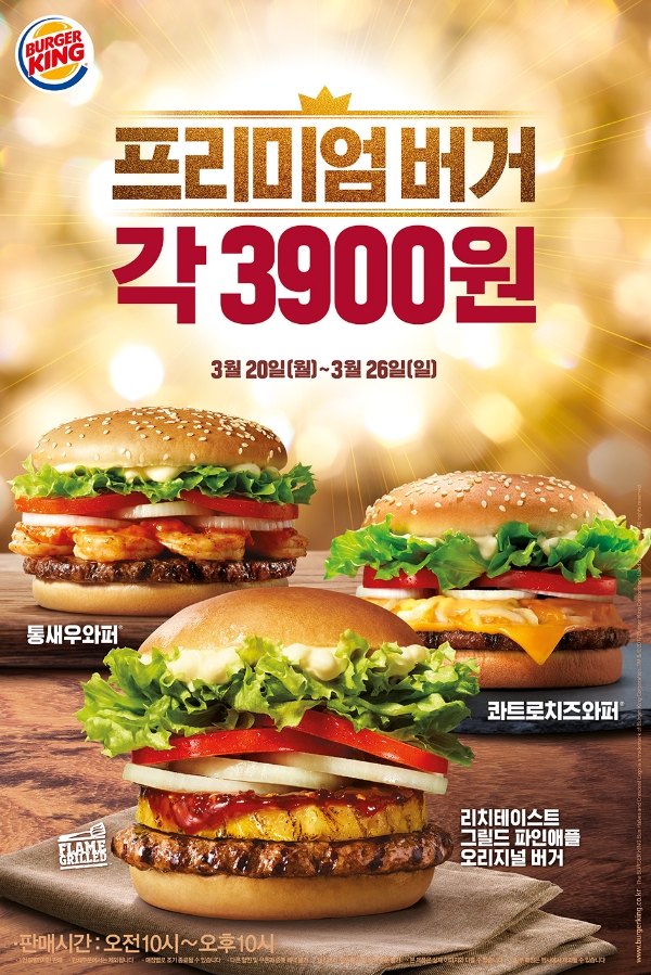 버거킹은 20일부터 7일간 인기 프리미엄 버거 3종인 그릴드 파인애플 오리지널 버거, 통새우와퍼, 콰트로치즈와퍼 단품을 각 3900원에 판매한다. 이번 프로모션은 일부 매장을 제외한 전국 버거킹 매장에서 진행된다.