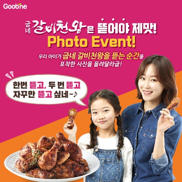 굽네치킨이 정통 갈비양념맛 치킨인 굽네 갈비천왕을 가장 맛있게 뜯는 아이들의 사진을 뽑는 ‘굽네 갈비천왕은 뜯어야 제 맛! 포토 이벤트’를 진행한다. 이번 이벤트는 어린 아이의 사진을 대상으로 한다. 응모 방법은 굽네 갈비천왕을 맛있고 재미있게 뜯는 아이의 모습을 포착해 사진을 찍어 개인 SNS에 업로드 하면 된다. 굽네치킨은 가장 맛있고 재치 넘치는 사진을 보내준 응모자 중 추첨을 통해 60명에게 ‘굽네 갈비천왕’ 모바일 쿠폰을 증정한다.